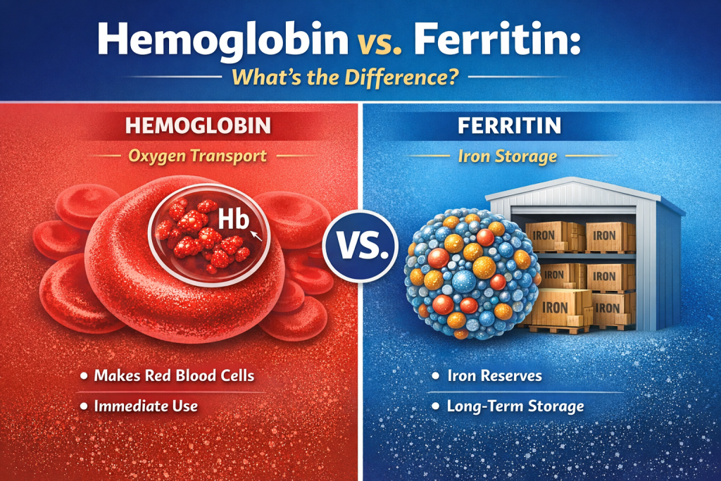 Ferritin, on the other hand, reflects your iron stores — your body’s reserve supply of iron. Think of hemoglobin as your “daily operating system” and ferritin as your “backup battery.”